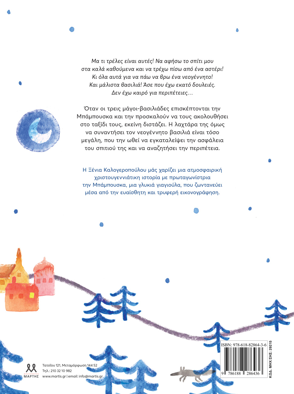 Η Ξένια Καλογεροπούλου μάς χαρίζει μια ατμοσφαιρική χριστουγεννιάτικη ιστορία με πρωταγωνίστρια την Μπάμπουσκα και η Άρτεμις Πρόβου την εικονογραφεί με ευαισθησία και τρυφερότητα.